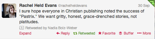 Her new book Pastrix: The Cranky, Beautiful Faith of a Sinner and Saint has been a source of encouragement for me in the last couple weeks. She is not your mamma’s preacher. Her language is colorful, her stories are gritty, and the message is drenched in the Gospel. The church she planted (House for All Sinners and Saints, ELCA) is home to drag queens, soccer moms, alcoholics, “good” Christian kids, babies, and elders. Each week the people gather to hear how Jesus showed up in the Scripture and how Jesus continues to show up in their lives today. As Rachel Held Evans tweeted: