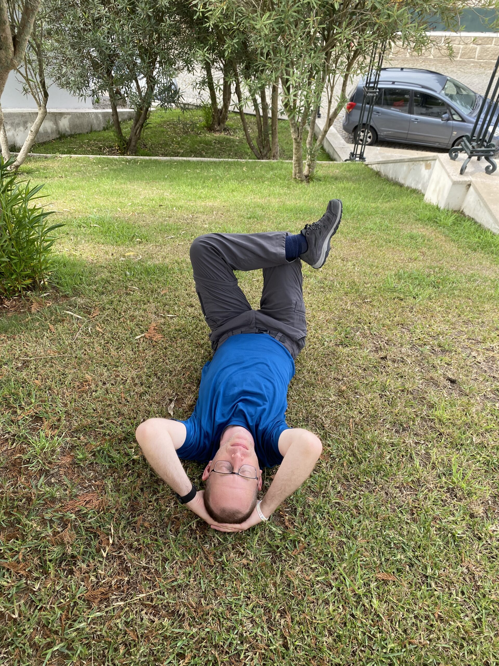 Tim lifts his face to the sun as he rests against a stone wall.