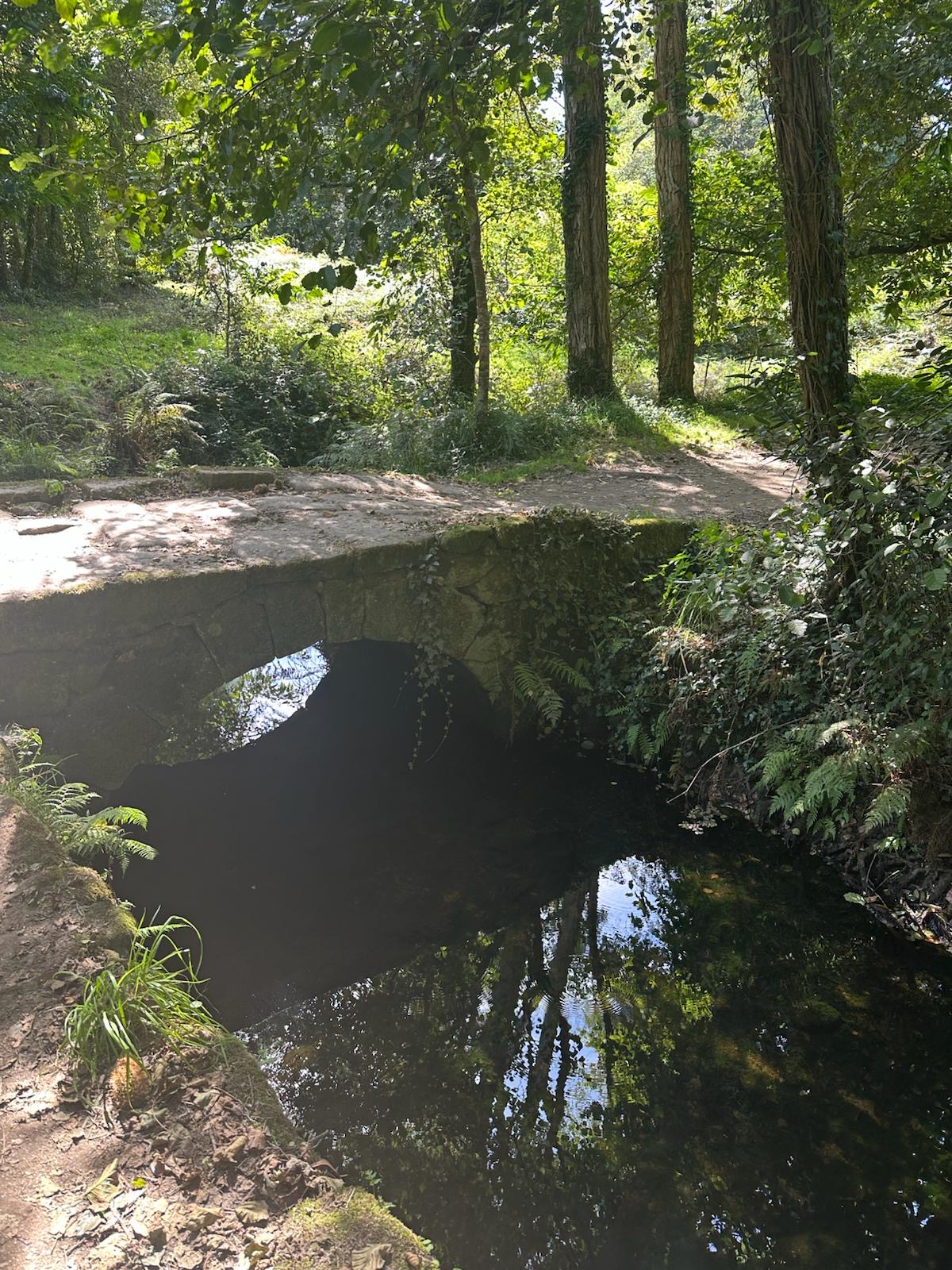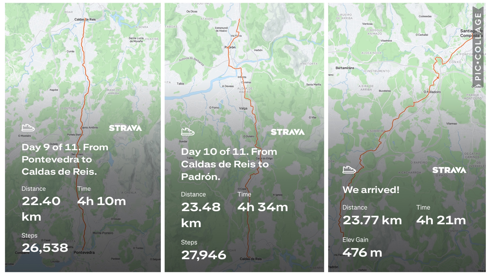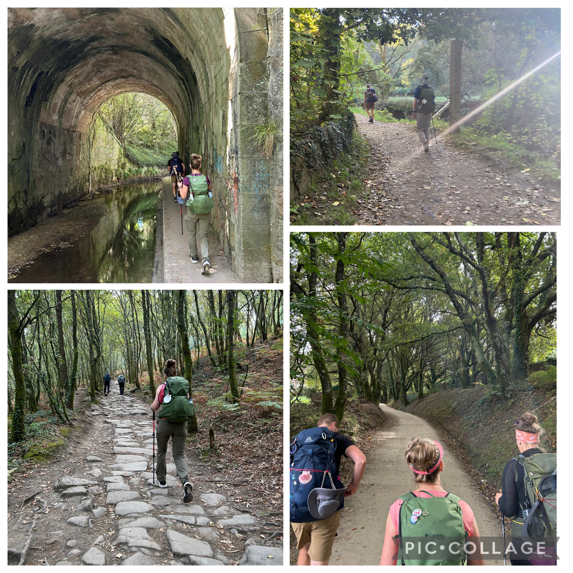 Walking under an overpass on Day 8 between Redondela and Pontevedra, Spain; enjoying the rising sun while walking through a forested area on our way to Redondela on Day 7; a stone path and then a dirt path through the forests on Day 11, our final day of walking to Santiago de Compostela.