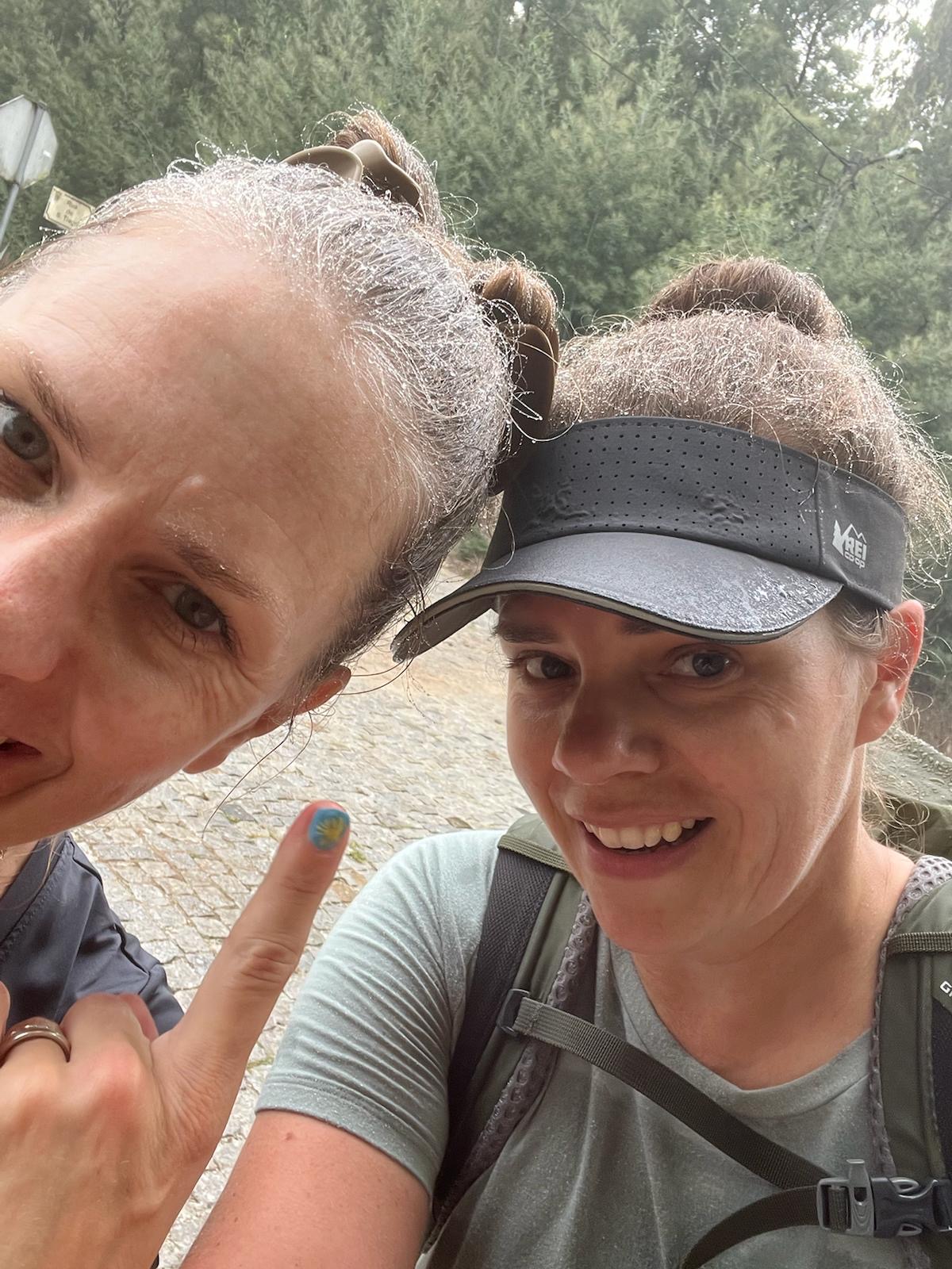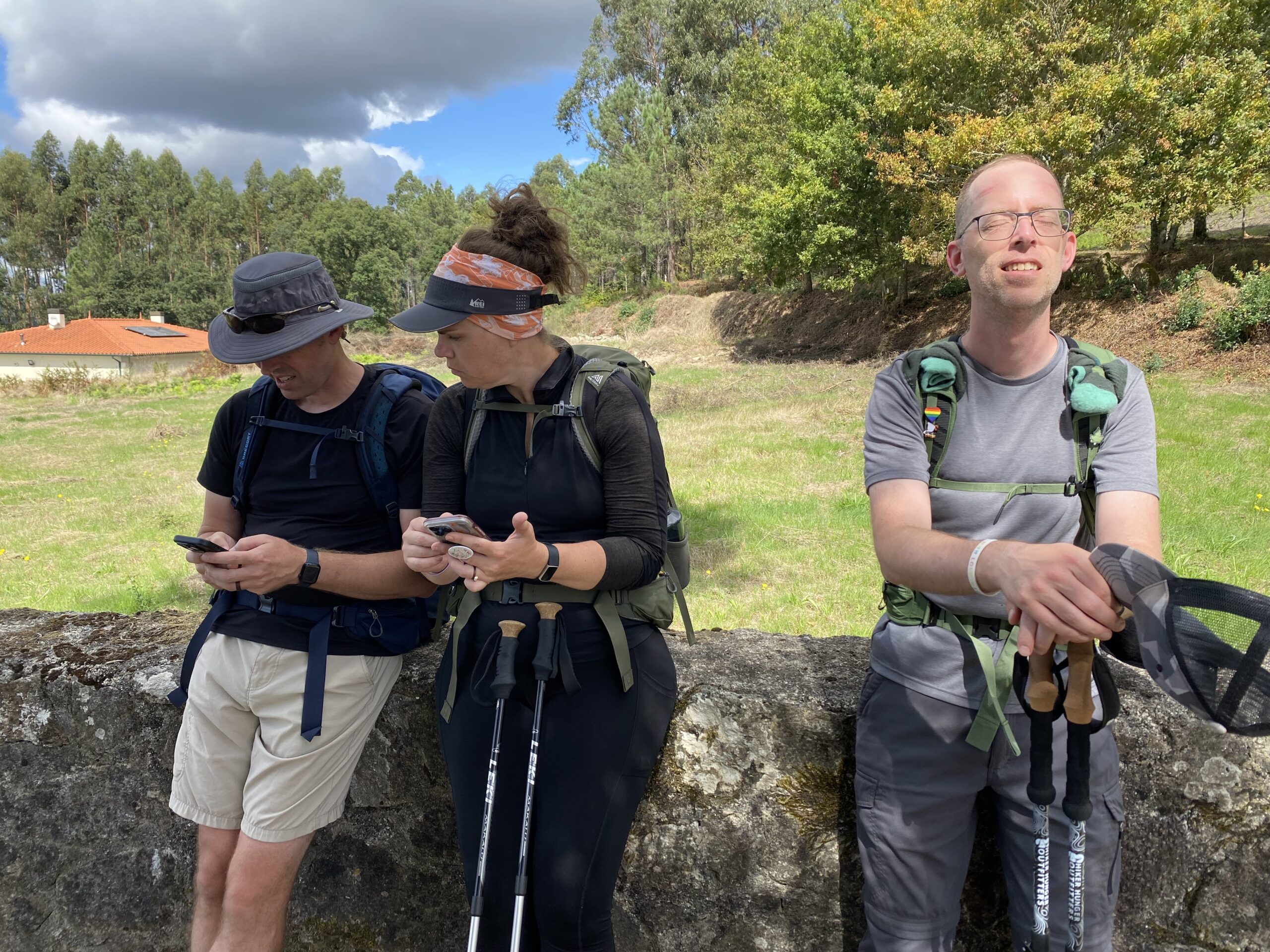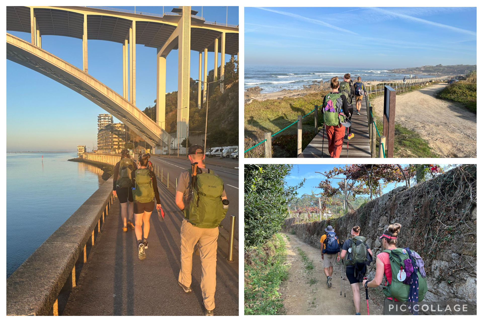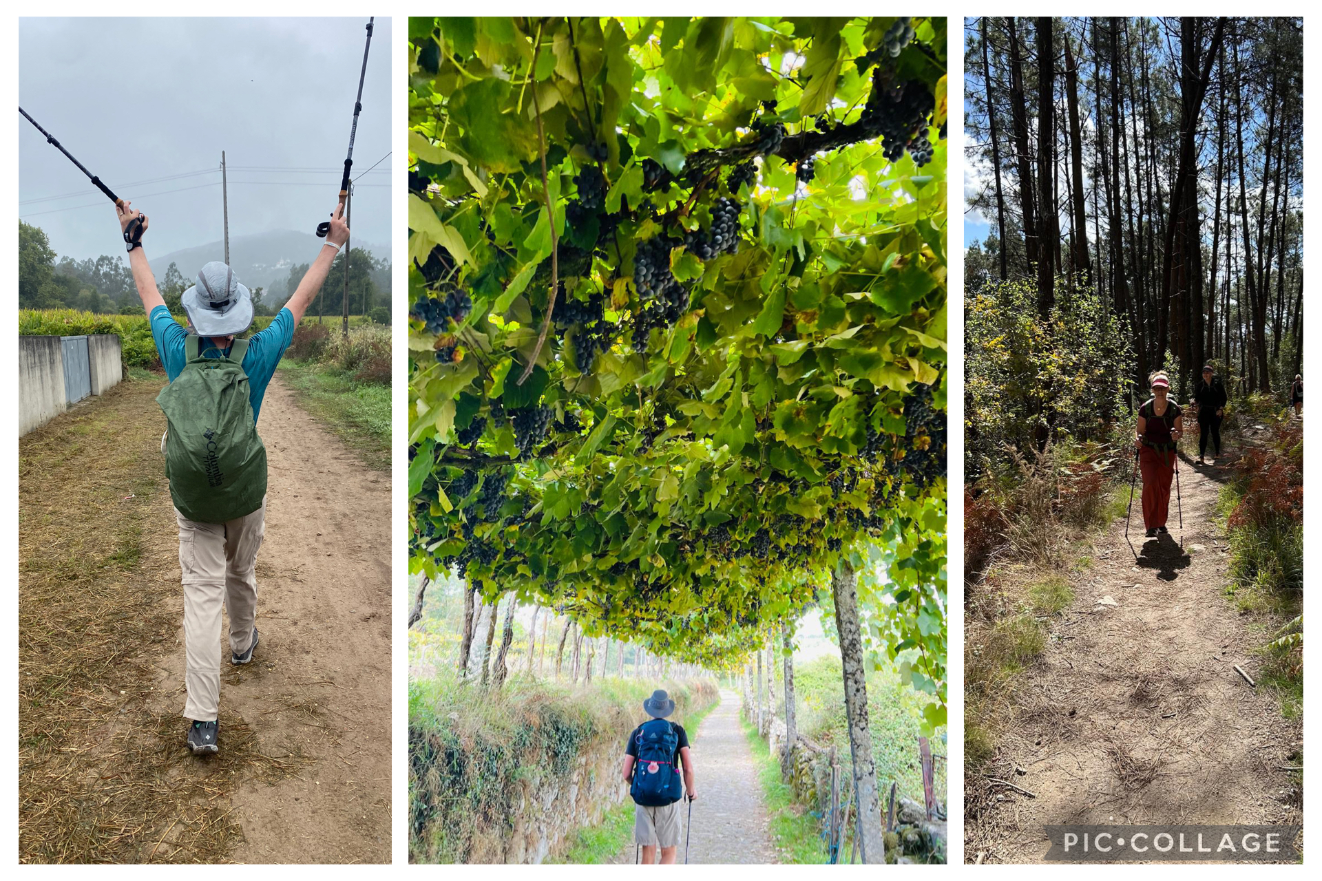 Tim rejoicing over the soft dirt walking surface between Barcelinhos and Ponte de Lima, Portugal, on Day 4; Robb walking beneath clusters of grapes and me hiking a steep incline between Ponte de Lima and Rubiaes, Portugal, on Day 5.