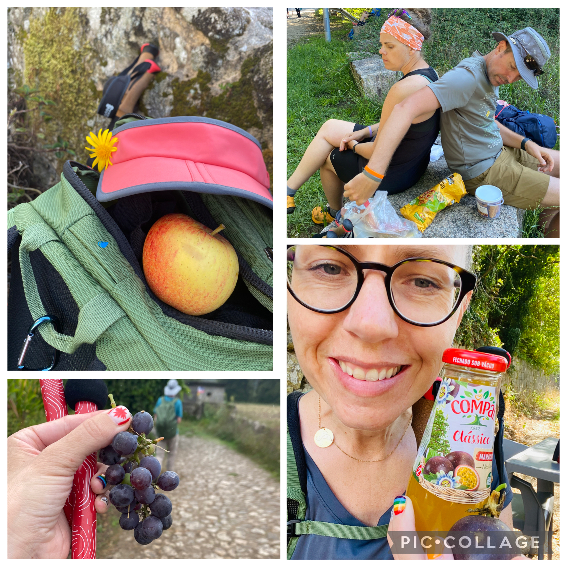 Stopping for lunch in a church graveyard between Caldas de Reis and Padrón, Spain on Day 10; Tracy and Robb providing each other back rests as we stopped for lunch on stone slabs between Tui and Redondela, Spain, on our second longest day of walking (21 miles on Day 7); a tiny bunch of delicious grapes the Creator provided on our longest day of walking (22.5 miles on Day 4 between Barcelinhos and Ponte de Lima, Portugal); delicious passion fruit juice and a passion fruit from a local vendor on Day 6 between Rubiaes, Portugal, and Tui, Spain.