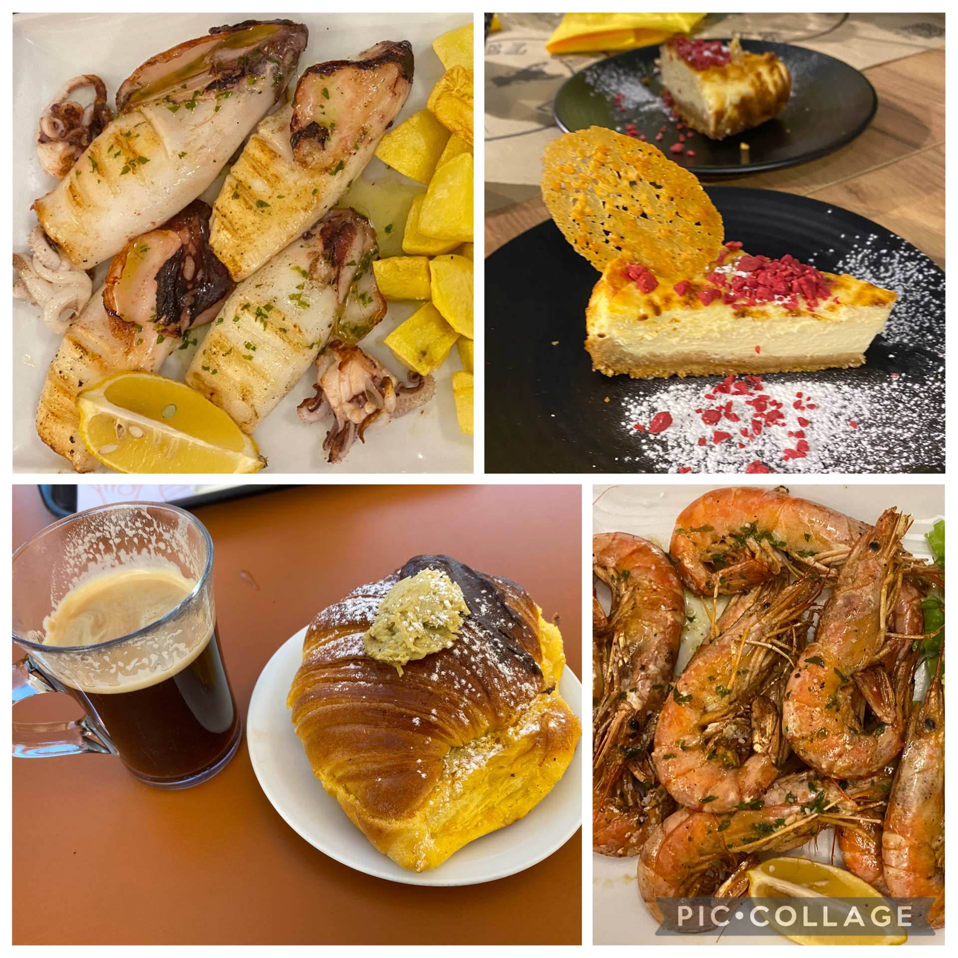 Squid, the best cheesecake, a chocolate and pistachio croissant, prawns.