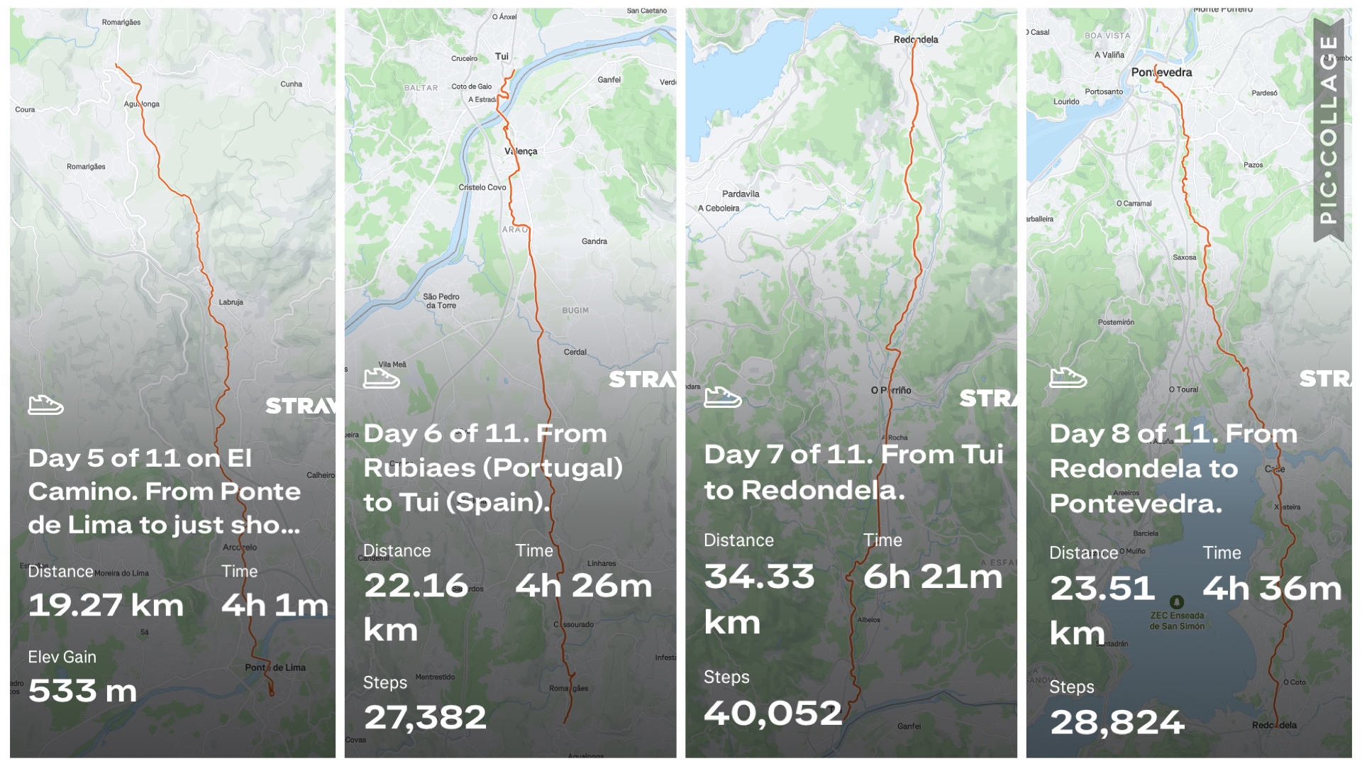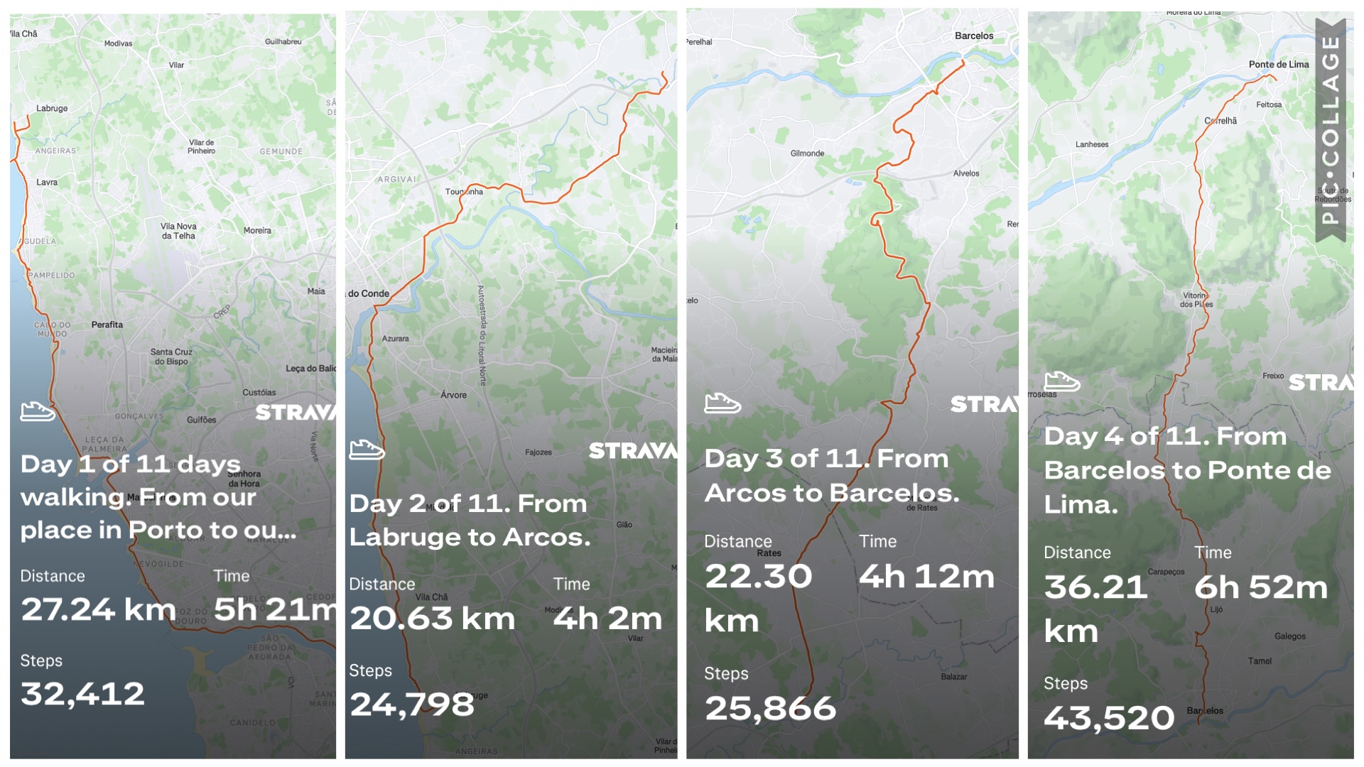 Leaving Porto, Portugal, on Day 1; enjoying the boardwalk of the coastal route on Day 2;