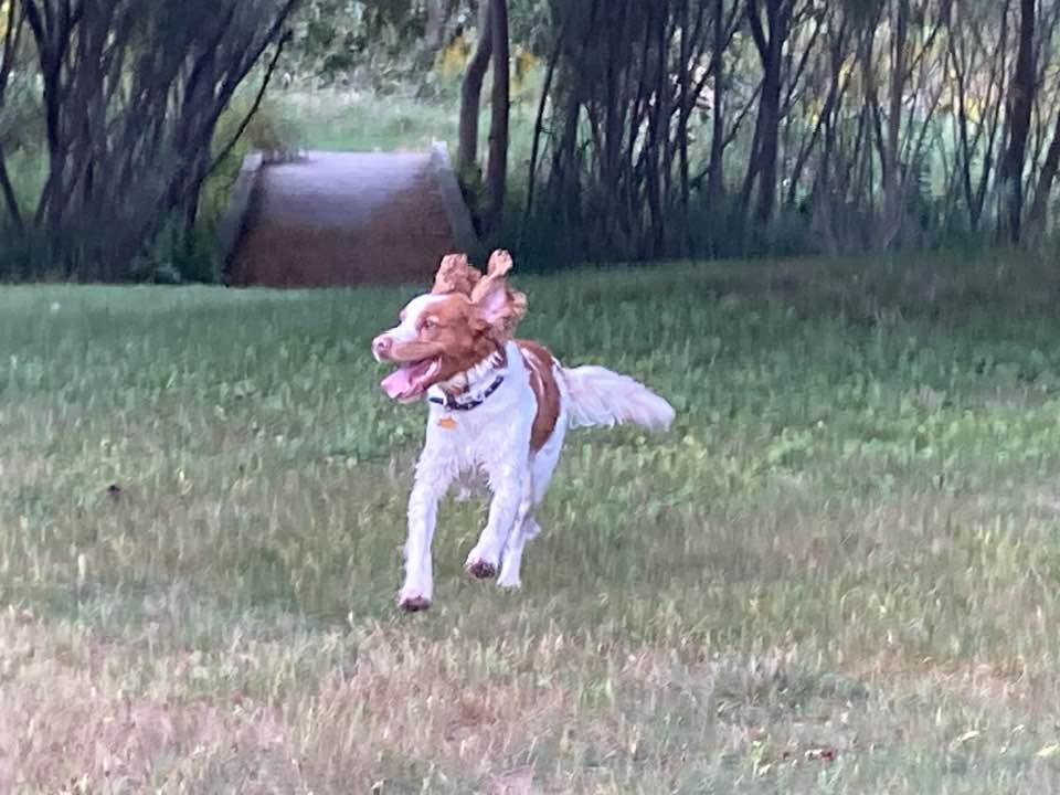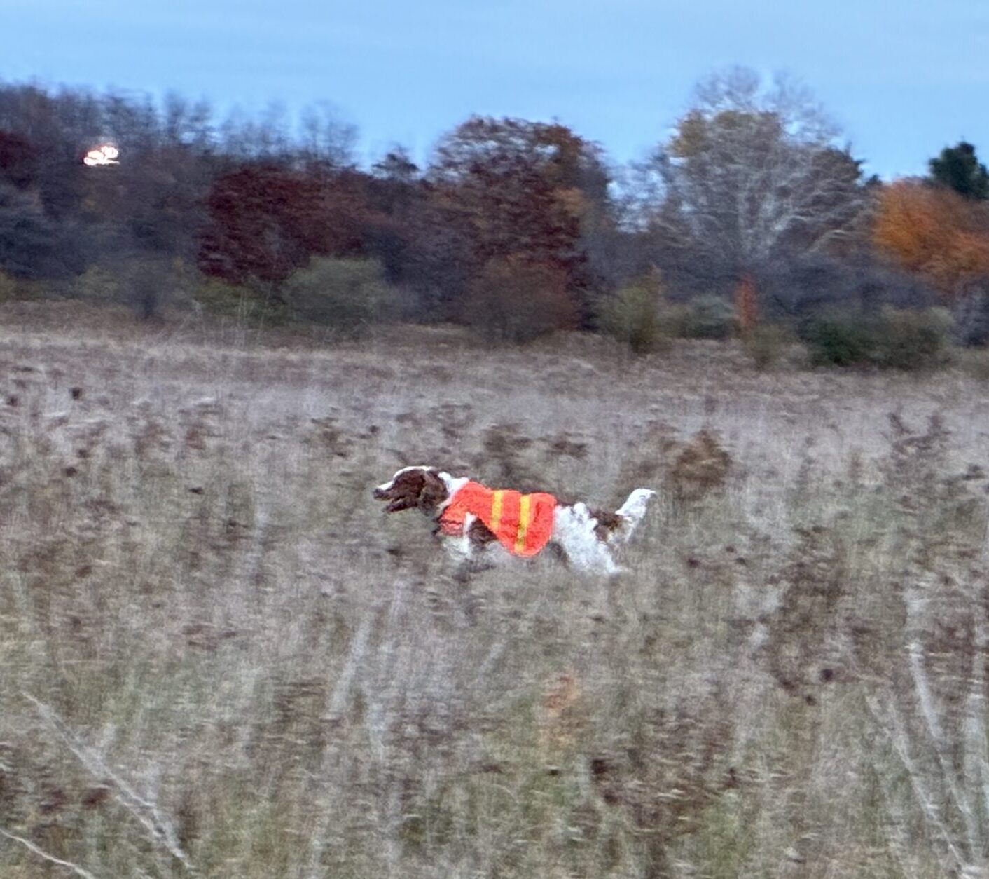 One of the best manifestations of canine joy comes when Dexter’s working a field. He’s a bird dog. When he runs through a field, he’s not only running—he is surfing. His ears fly up, his face looks ecstatic, and he expresses rapture in finally getting to have “run around time.”