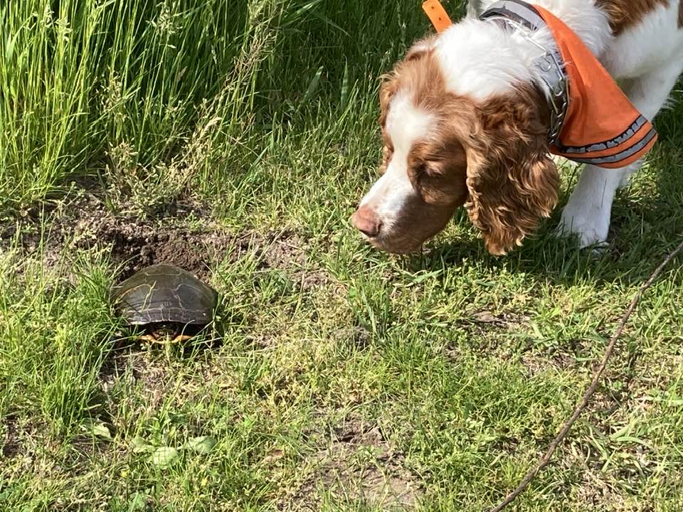 What I’m particularly amazed by are the characteristics of his breed. He’s a Brittany, a bird dog known for his nose, along with family-friendly qualities of a medium-sized, gentle, trainable canine. He’s curious, dangerously so when he sticks his snout into holes in the ground. Yet, he also senses that approaching a nearby snake might be something to be both curious and cautious about, particularly because Michigan’s Eastern Hognose raises its head in a way that’s like a python.