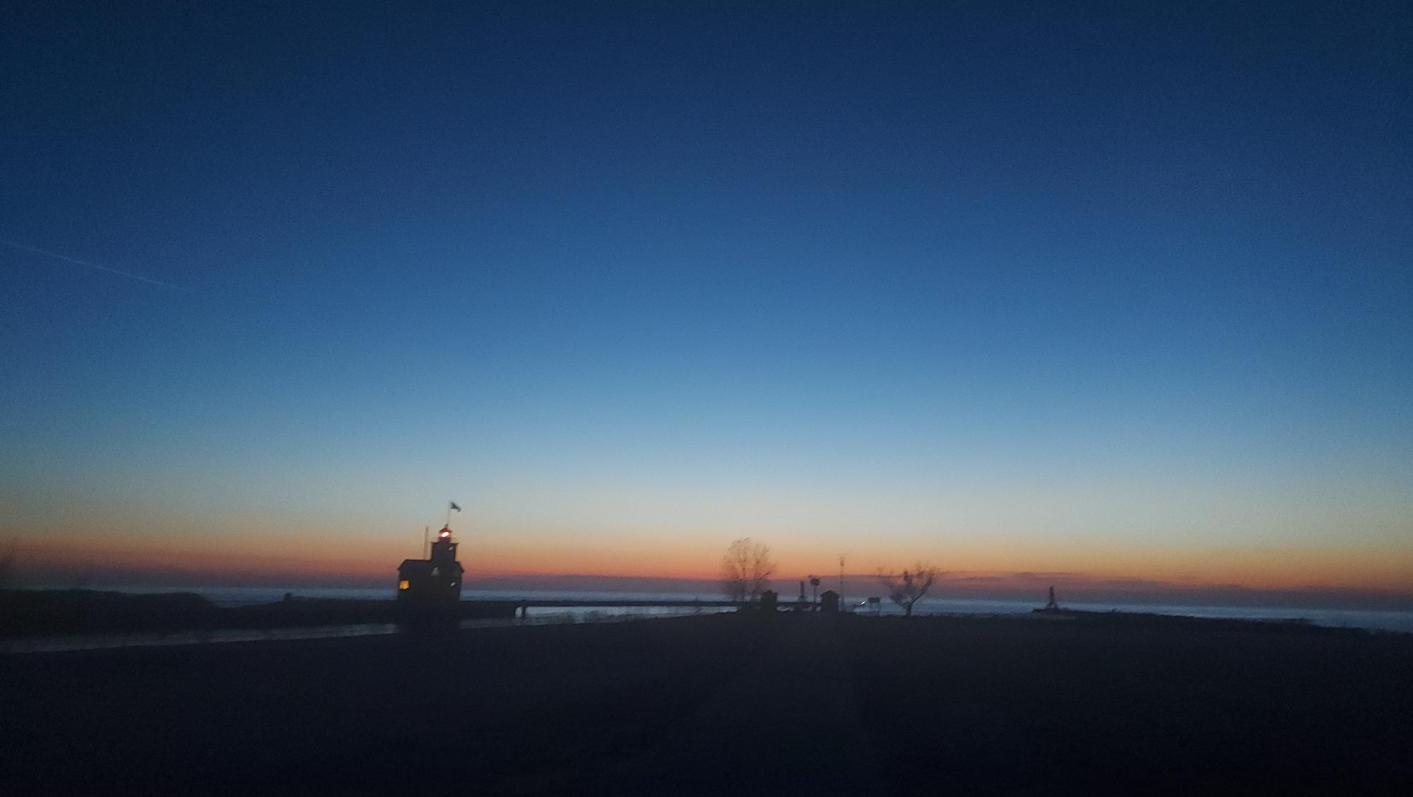 After that, a drive out to Holland State Park to stand next to the Big Lake answering a pull I’ve known since I was a boy. As darkness was falling, I lamented that sunset had well passed. Shrouded-sleep sailboats bunked together on the hard dreaming of summer-faire winds and Big Lake distances. Gentle waves were breaking. Fisherfolk silhouetted on the end of the pier. A few fishing boats trolled the channel. I stood there watching the glow fade from the empty watery horizon and tried to tamp down the inner voice telling me it was getting late. I stood and collected the day.