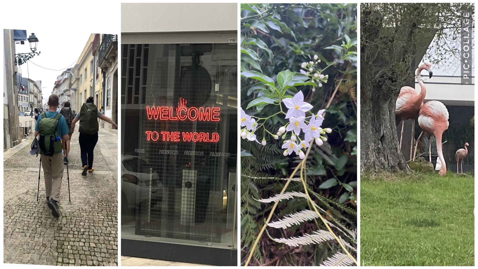 …of my family walking along the cobblestones, a neon sign in the window of a gym that said, “Welcome to the World” (I felt so welcome!), the white flowers of a potato vine (which is also known as the jasmine nightshade: much preferred), the largest flamingo lawn ornaments I had ever seen.