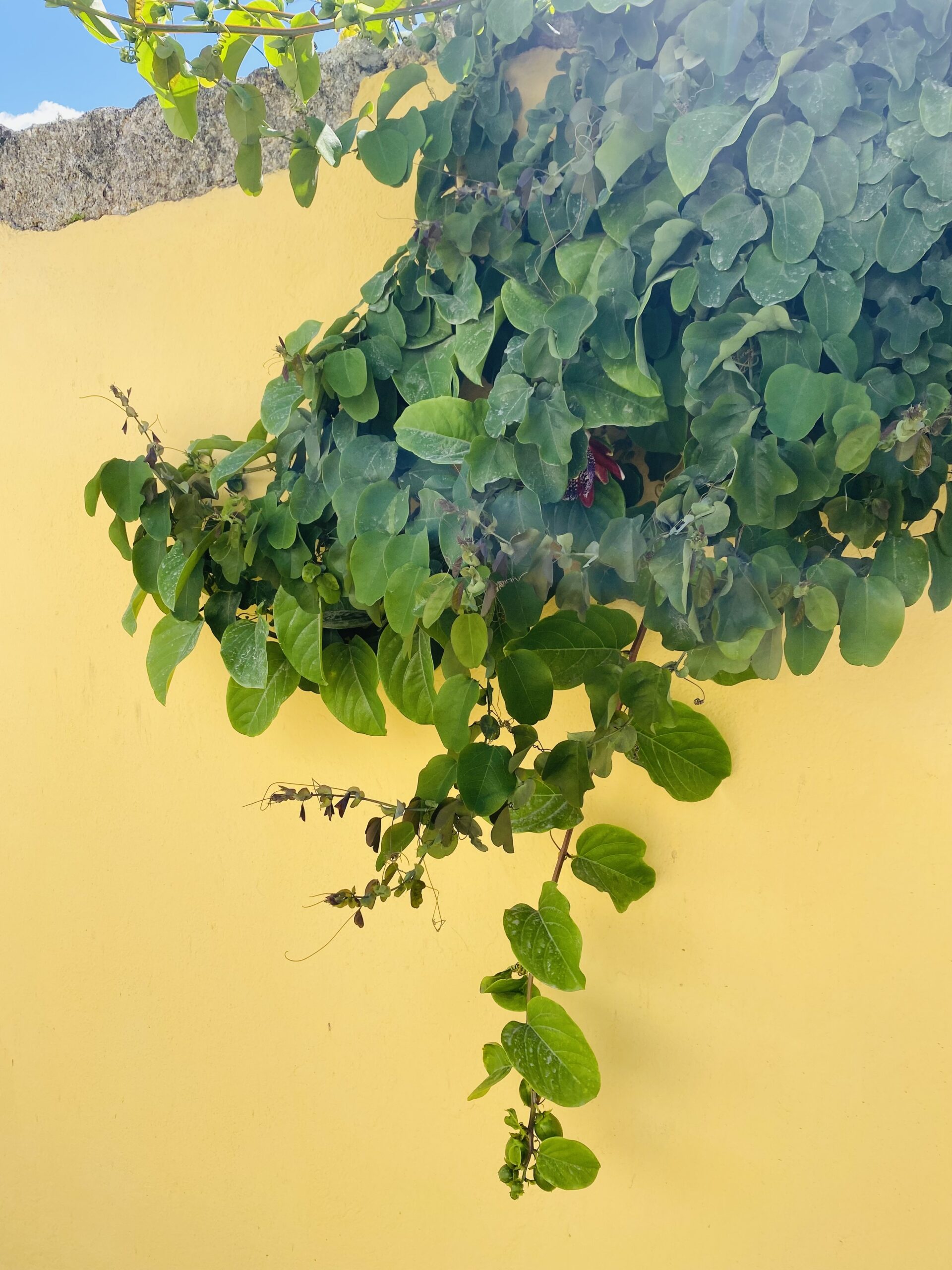As we walked along a garden wall that afternoon, I was struck by the contrast of a green plant against the bright yellow paint. I took a quick picture, and as I walked by, I turned to look again. “Oh!” I thought, “the light catches the contrasting colors better from this angle!” Knowing a second photo would mean I would have to run to catch up to my family, I stopped anyway and took another picture.