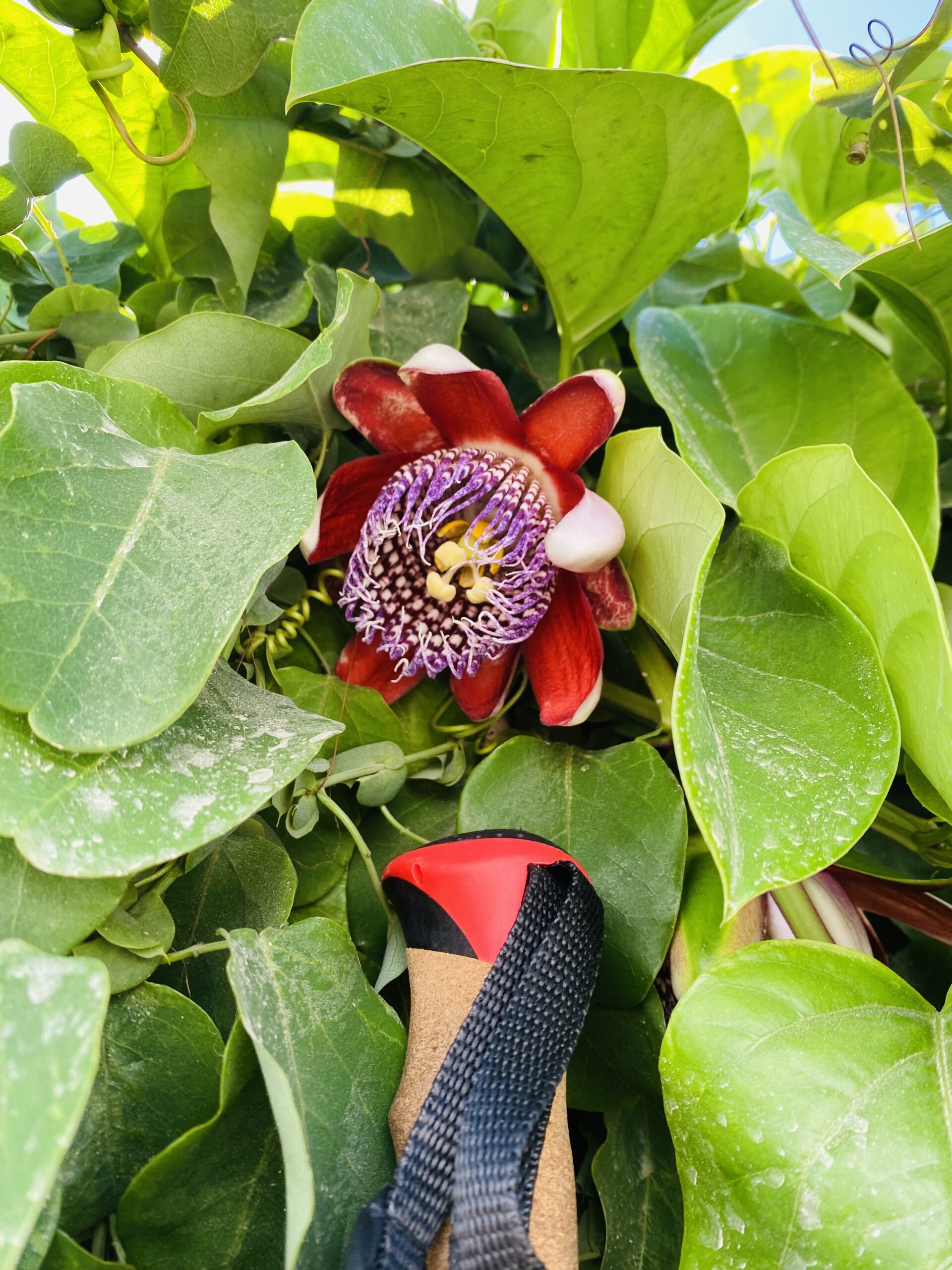 A red passiflora. Its sepals, petals, and corona just beginning to close in around the work of fruit-growing. Another glimmer. Another moment. Another sip. A strong and vibrant beauty that I would not have seen had I not looked back.