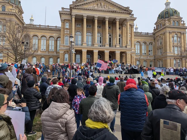 When we arrived at the capitol, things went downhill. There was the all-too-predictable buzzy and unpowered sound system. The roster of speakers was too long and all of them needed some lessons from Nadia. They weren’t compelling or winsome. Mainly they were angry and haranguing — understandable, but still. Often their biggest reactions came when they dropped the F-bomb, repeatedly. There was no vision, no hopefulness. Mainly snarkiness. Was there nowhere to be found in all of Des Moines, some golden-throated orator who could lift us and make us soar? Why not have us sing together?