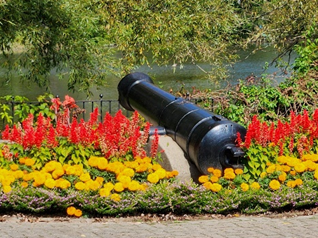 Adjacent to Stratford’s war monument sit two cannons, each circled by vibrant flowers. They convey the same tension as the sculpture—the ugly tamed by the beautiful. Brute Force stands inert and silent amid Spiritual Humanity’s abundant life. That’s the biblical image of God’s good future, when kindness and peace will wipe out cruelty and violence. Swords beat into plowshares. Blooming flowers overspread weapons of war.