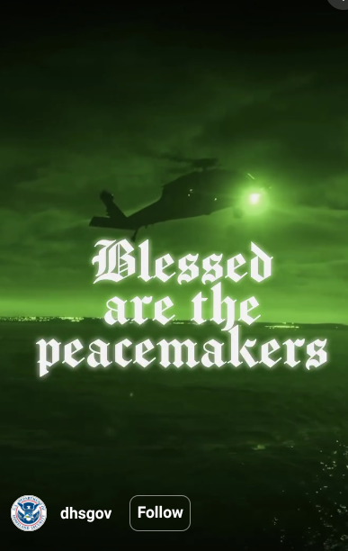 A few weeks ago, the Department of Homeland Security posted a short video on their social media pages. The text “Blessed Are the Peacemakers” appears at the beginning in a Gothic-style script, followed by just over a minute of video of DHS conducting what appear to be military operations. The video doesn’t give context for these operations, but it is captioned with the full phrase: “Blessed are the peacemakers, for they shall be called sons of God.” —Matthew 5:9