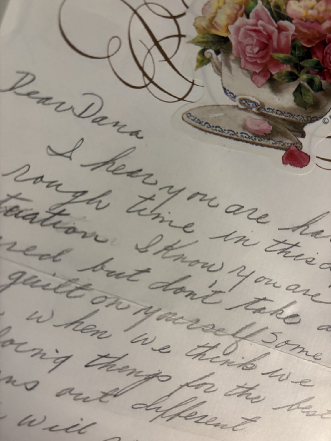 But rather than either of those things, Grandma sent a letter to my dorm room. In her familiar cursive on flowered stationery, she wrote, “Dear Dana, I hear you are having a rough time in this difficult situation. I know you are scared, but don’t take all the guilt on yourself. Sometimes, when we think we are doing things for the best, it turns out differently.” She went on to encourage me to “not let anything destroy my beautiful spirit” and assured me that I was supported and loved.